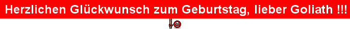 Lieber Goliath, herzlichen Glückwunsch und alles Gute zu deinem Geburtstag! Ich wünsche dir ein ganzes Jahr lang Glück und Zufriedensein, Gesundheit und Wohlfühlen, Freude und Spasshaben - und das für jeden einzelnen Tag!