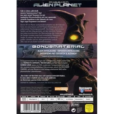 Story: Noch in diesem Jahrhundert werden unbemannte Raumsonden in den Weltraum geschickt, um nach Leben auf anderen Planeten zu suchen. Was wre, wenn sie fndig werden? Darwin IV: ein Planet, sechseinhalb Lichtjahre von der Erde entfernt, mit zwei Sonnen und 60 Prozent Erdanziehungskraft. Das unbemannte Forschungsraumschiff "Von Braun" will dort mit Hilfe dreier Sonden smtliche Formen von Leben erforschen. Zur berraschung aller finden sich die Sonden inmitten eines hoch entwickelten kosystems wieder. Es scheint, dass die Lebewesen auf Darwin IV grer, schneller und vor allem gefhrlicher sind als alles, was wir uns bisher vorstellen konnten... In Zusammenarbeit mit einigen der intelligentesten Kpfe unserer Zeit, wie Stephen W. Hawking, Michio Kaku und "Star Wars"-Schpfer George Lucas, sowie mit Hilfe modernster Computeranimationen und den neuesten wissenschaftlichen Erkenntnissen, schickt Sie diese phantastische "Discovery Channel"-Dokumentation auf eine Mission in eine bislang unbekannte Welt...