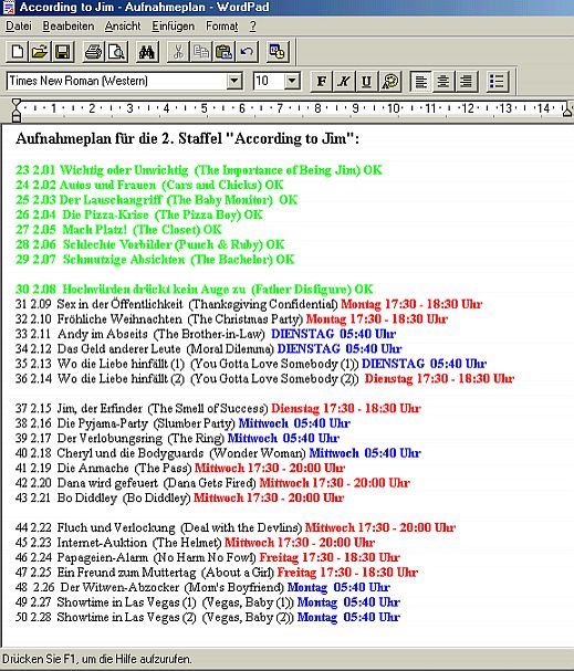 Ich zumindest verzweifel bald an den Mist, am besten Erklren kann ich es durch meinen Aufnahmeplan. ROT bedeutet Mittags aufnehmen sind leider auch dann Einblendungen drin. BLAU bedeutet Morgens  aufnehmen sind keine Einblendungen drin und nur 2 Werbepausen.