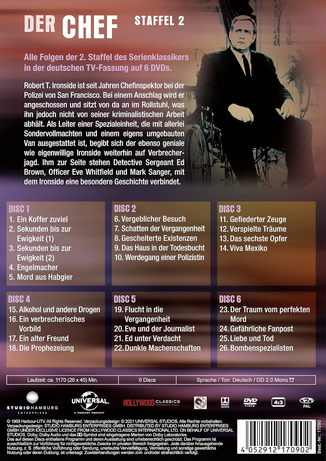 Ich habe jetzt Staffel 2 bekommen. Staffel 3 ist schon vorbestellt. Staffel 1 habe ich nicht gekauft, da ich sie bereits habe von damals, als man sie in 2 Teilen verkaufte. Aber ich habe mir Ironside Staffel 1 im Original bestellt, weil da der Pilotfilm in voller Länge drauf ist.